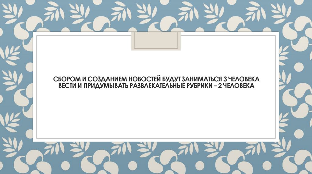СБОРОМ И СОЗДАНИЕМ НОВОСТЕЙ БУДУТ ЗАНИМАТЬСЯ 3 ЧЕЛОВЕКАВЕСТИ И ПРИДУМЫВАТЬ РАЗВЛЕКАТЕЛЬНЫЕ РУБРИКИ – 2 ЧЕЛОВЕКА