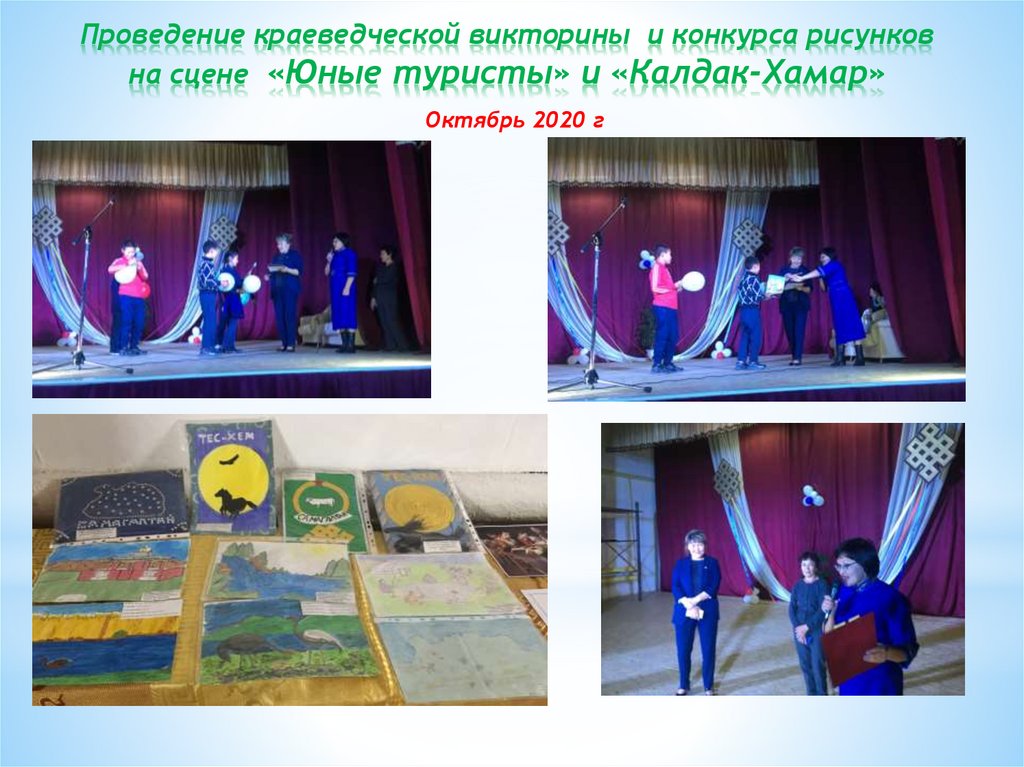 Проведение краеведческой викторины и конкурса рисунковна сцене «Юные туристы» и «Калдак-Хамар»
