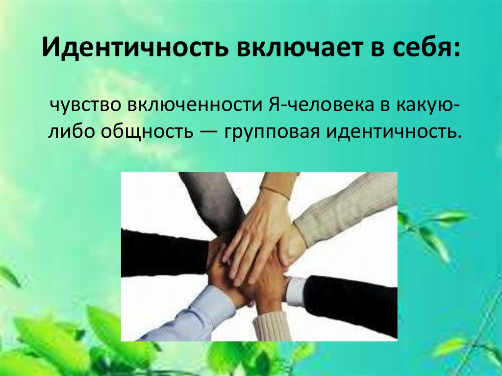 Идентичность включает в себя:чувство включенности Я-человека в какуюлибо общность — групповая идентичность.