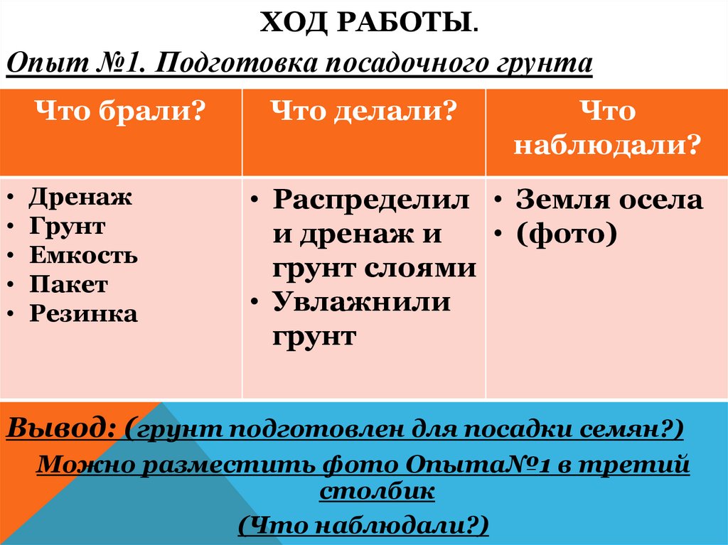 ХОД РАБОТЫ.Опыт №1. Подготовка посадочного грунта