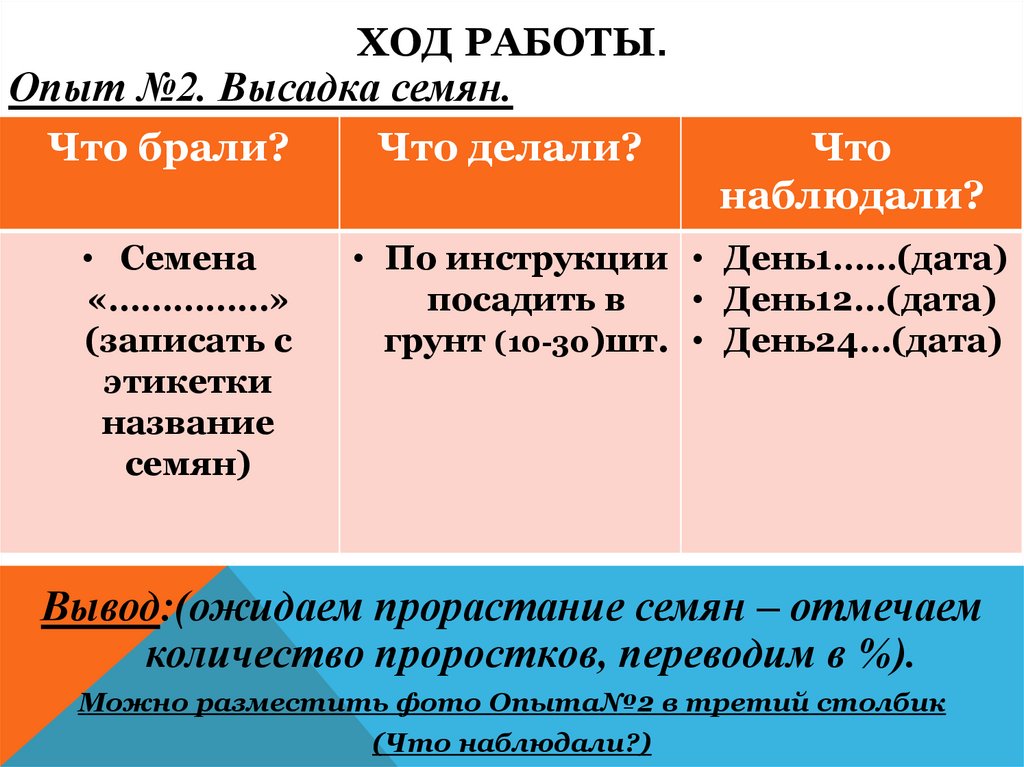 ХОД РАБОТЫ.Опыт №2. Высадка семян.