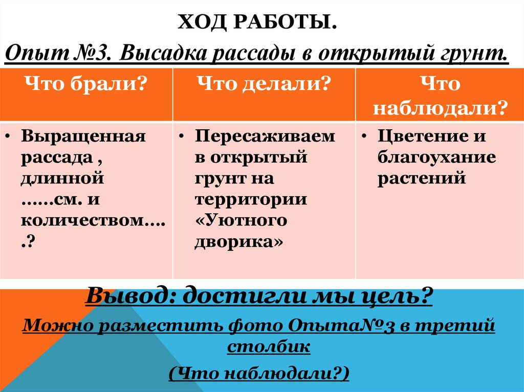 ХОД РАБОТЫ.Опыт №3. Высадка рассады в открытый грунт.