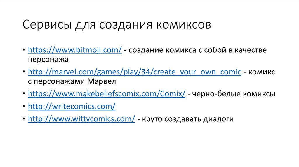 Сервисы для создания комиксов• https://www.bitmoji.com/ - создание комикса с собой в качестве