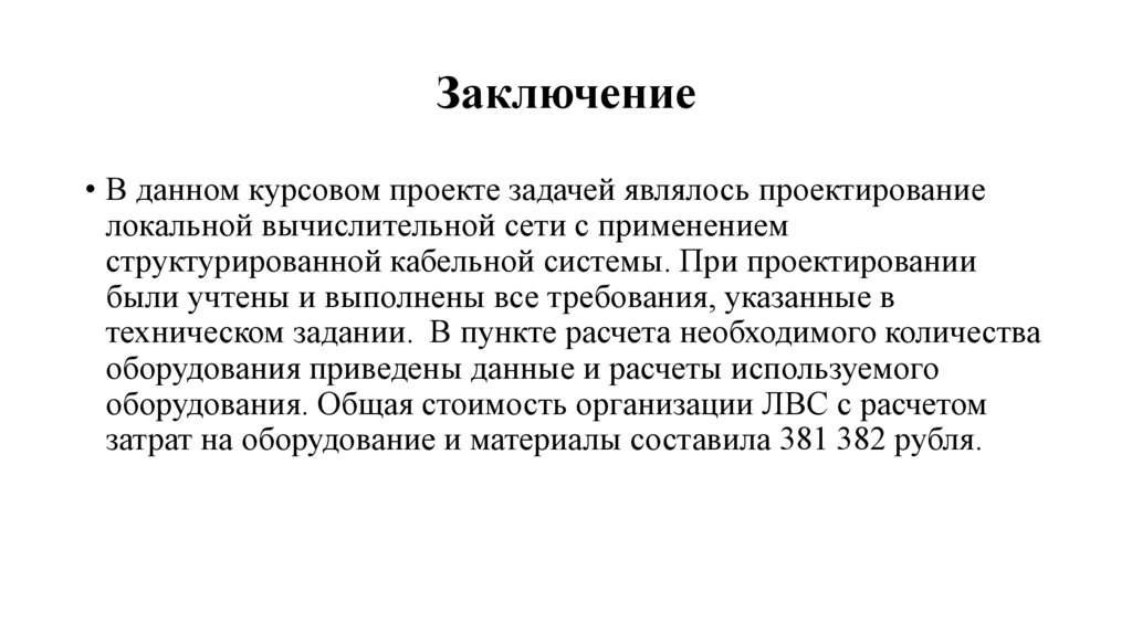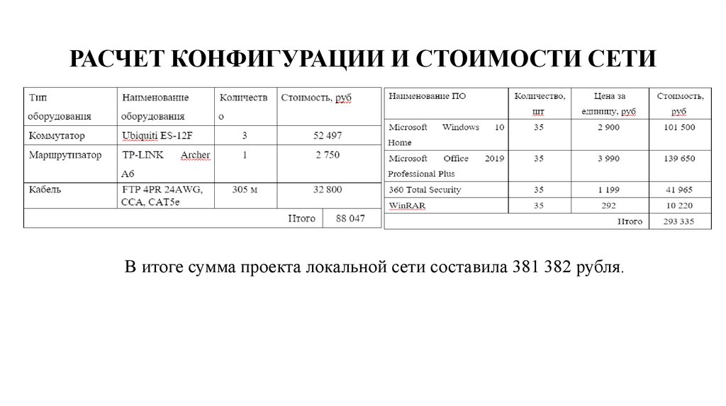 РАСЧЕТ КОНФИГУРАЦИИ И СТОИМОСТИ СЕТИВ итоге сумма проекта локальной сети составила 381 382 рубля.
