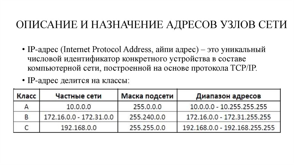 ОПИСАНИЕ И НАЗНАЧЕНИЕ АДРЕСОВ УЗЛОВ СЕТИ• IP-адрес (Internet Protocol Address, айпи адрес) – это уникальный