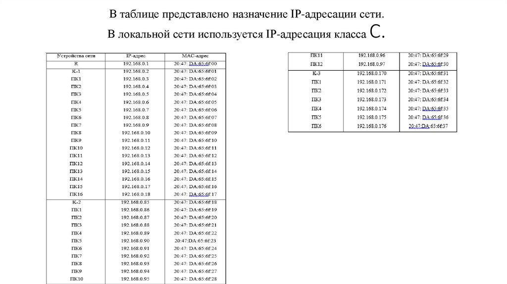 В таблице представлено назначение IP-адресации сети.В локальной сети используется IP-адресация класса