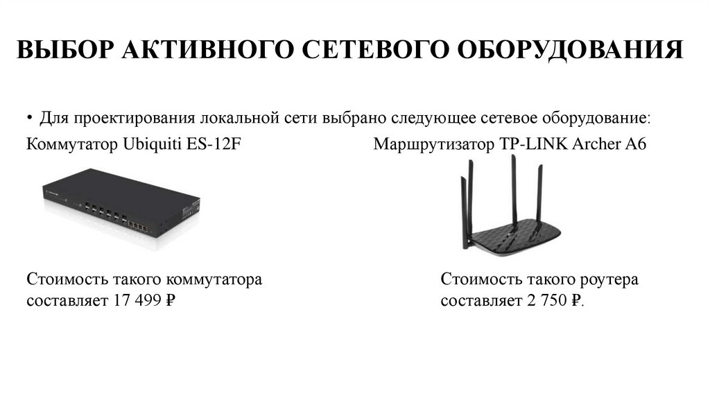 ВЫБОР АКТИВНОГО СЕТЕВОГО ОБОРУДОВАНИЯ• Для проектирования локальной сети выбрано следующее сетевое оборудование: