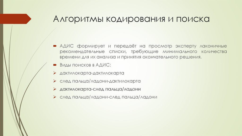 Алгоритмы кодирования и поискаАДИС формирует и передаёт на просмотр эксперту лаконичные