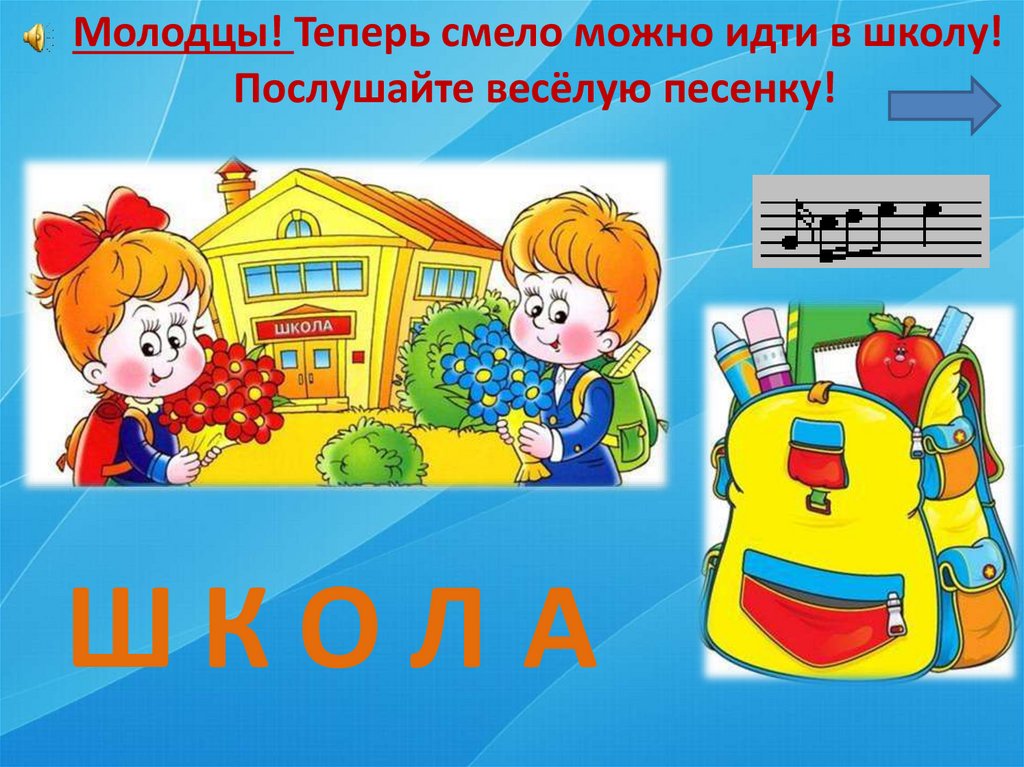 Молодцы! Теперь смело можно идти в школу!Послушайте весёлую песенку!
