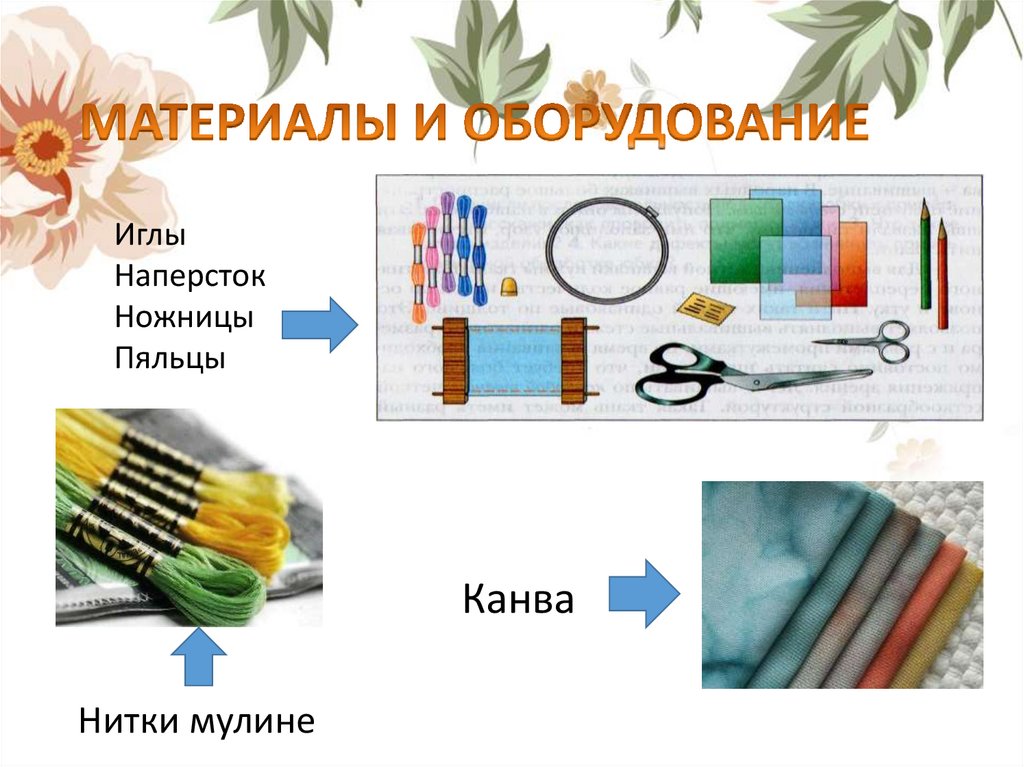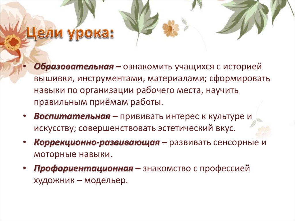 • Образовательная – ознакомить учащихся с историейвышивки, инструментами, материалами; сформировать