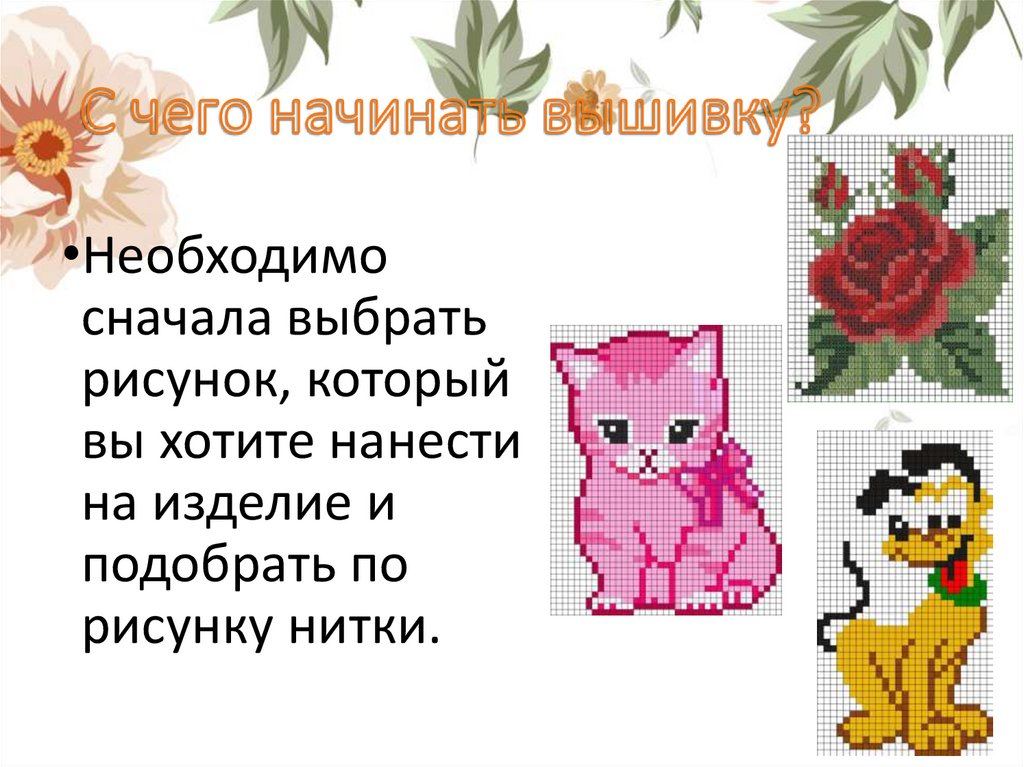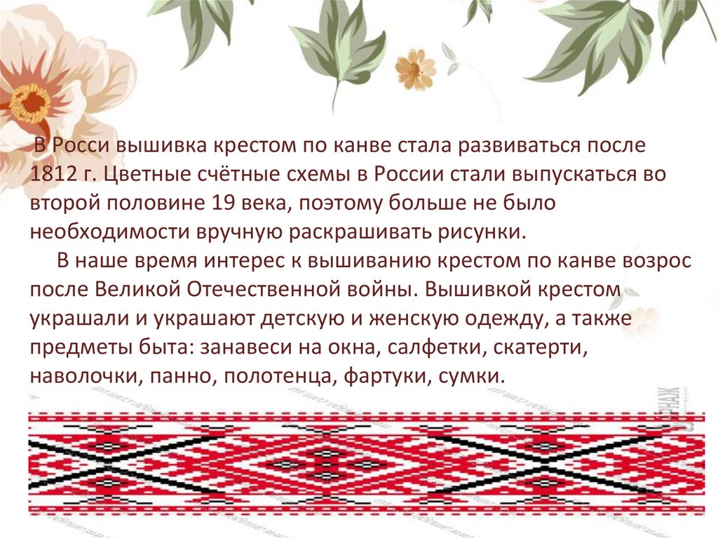 В Росси вышивка крестом по канве стала развиваться после1812 г. Цветные счётные схемы в России стали выпускаться во
