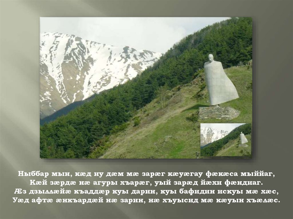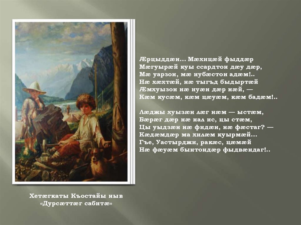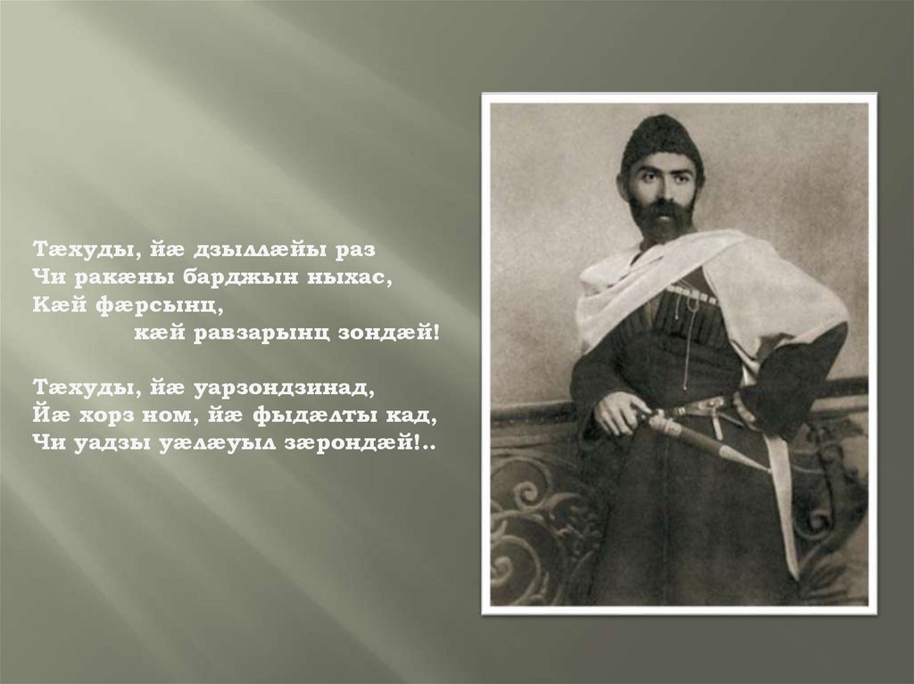 Ныббар мын, кæд иу дæм мæ зарæг кæуæгау фæкæса мыййаг,Кæй зæрдæ нæ агуры хъарæг, уый зарæд йæхи фæндиаг.