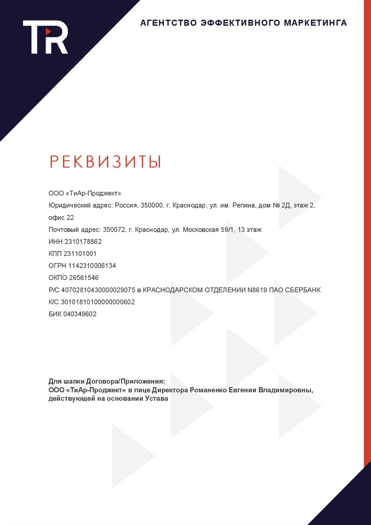 ООО «ТиАр-Проджект» в лице Директора Романенко Евгении Владимировны,