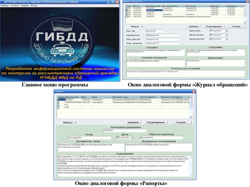 Главное меню программыОкно диалоговой формы «Журнал обращений»
