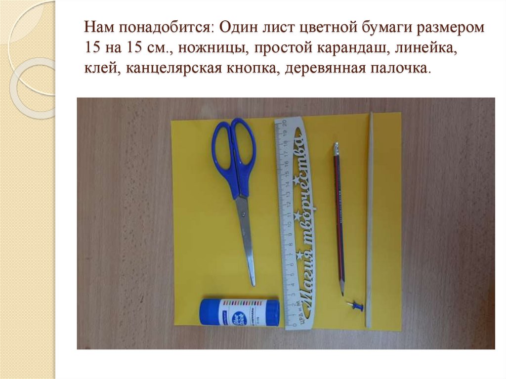 Нам понадобится: Один лист цветной бумаги размером15 на 15 см., ножницы, простой карандаш, линейка,