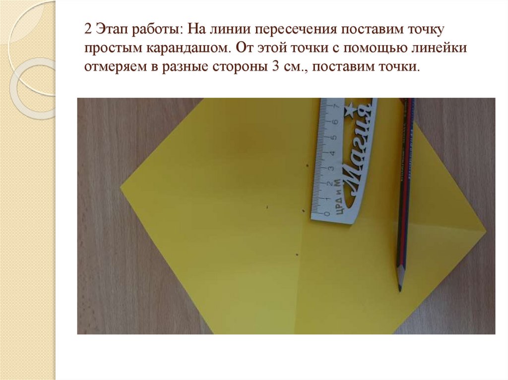 2 Этап работы: На линии пересечения поставим точкупростым карандашом. От этой точки с помощью линейки