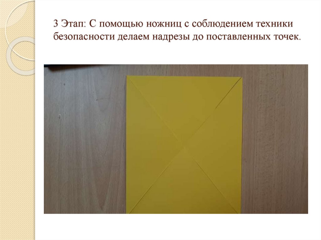 3 Этап: С помощью ножниц с соблюдением техникибезопасности делаем надрезы до поставленных точек.