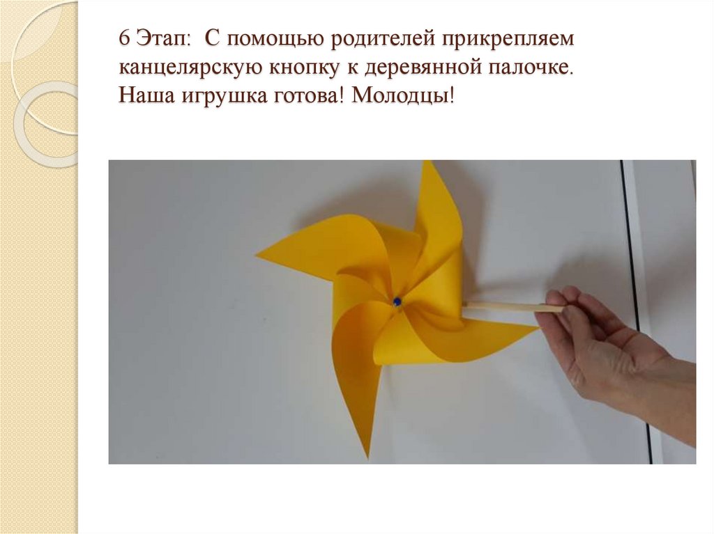 6 Этап: С помощью родителей прикрепляемканцелярскую кнопку к деревянной палочке.