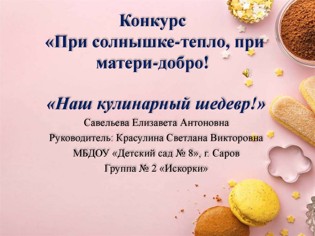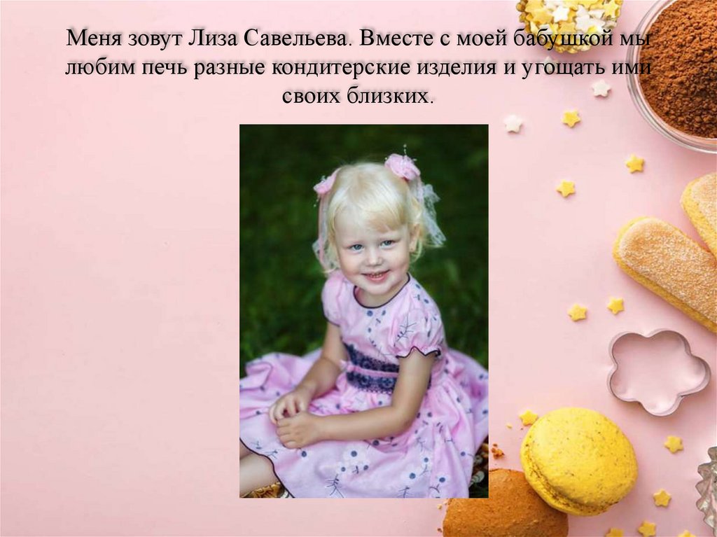 Меня зовут Лиза Савельева. Вместе с моей бабушкой мылюбим печь разные кондитерские изделия и угощать ими