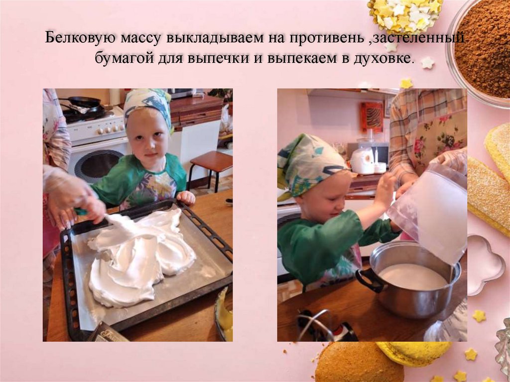Белковую массу выкладываем на противень ,застеленныйбумагой для выпечки и выпекаем в духовке.