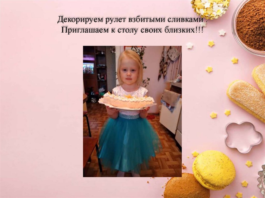 Декорируем рулет взбитыми сливками .Приглашаем к столу своих близких!!!