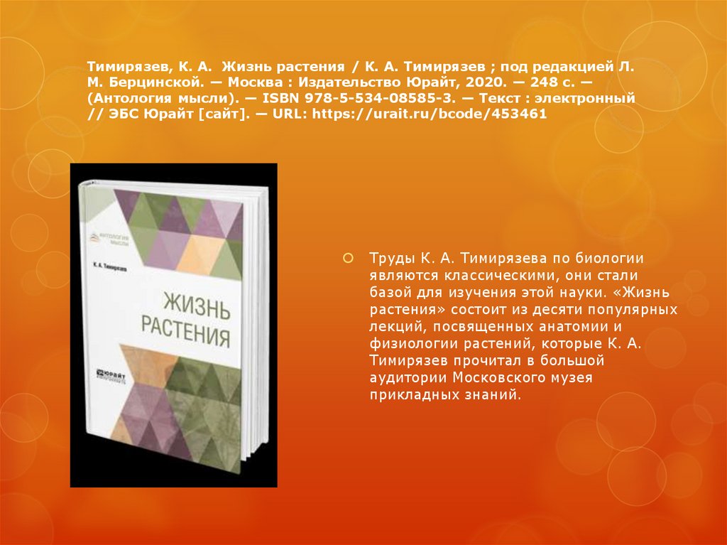 Тимирязев, К. А. Жизнь растения / К. А. Тимирязев ; под редакцией Л.М. Берцинской. — Москва : Издательство Юрайт, 2020. — 248 с. —