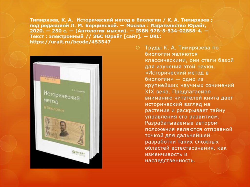 Тимирязев, К. А. Исторический метод в биологии / К. А. Тимирязев ;под редакцией Л. М. Берцинской. — Москва : Издательство Юрайт,