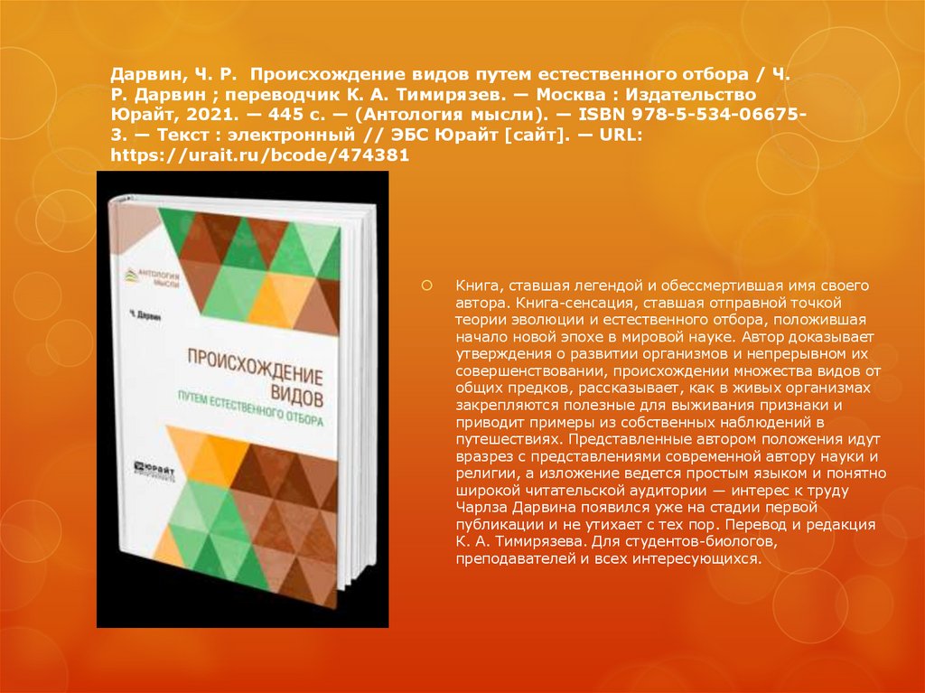 Дарвин, Ч. Р. Происхождение видов путем естественного отбора / Ч.Р. Дарвин ; переводчик К. А. Тимирязев. — Москва : Издательство
