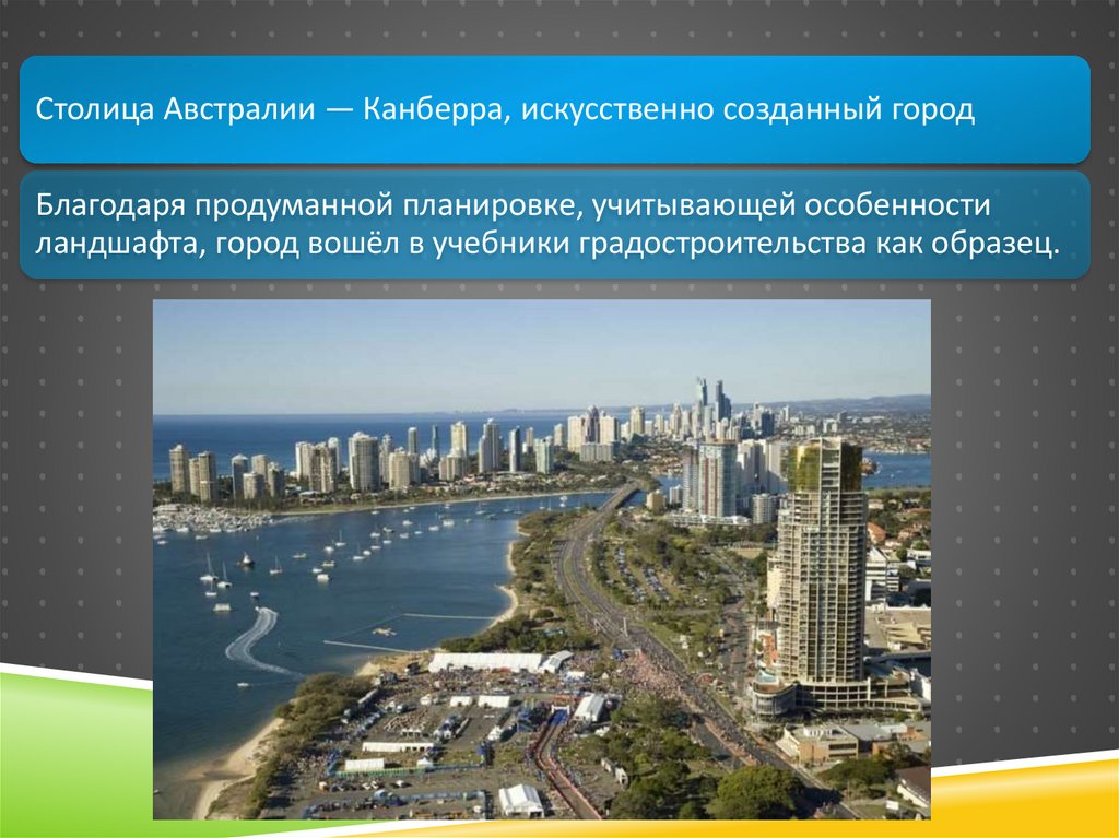Столица Австралии — Канберра, искусственно созданный городБлагодаря продуманной планировке, учитывающей особенности