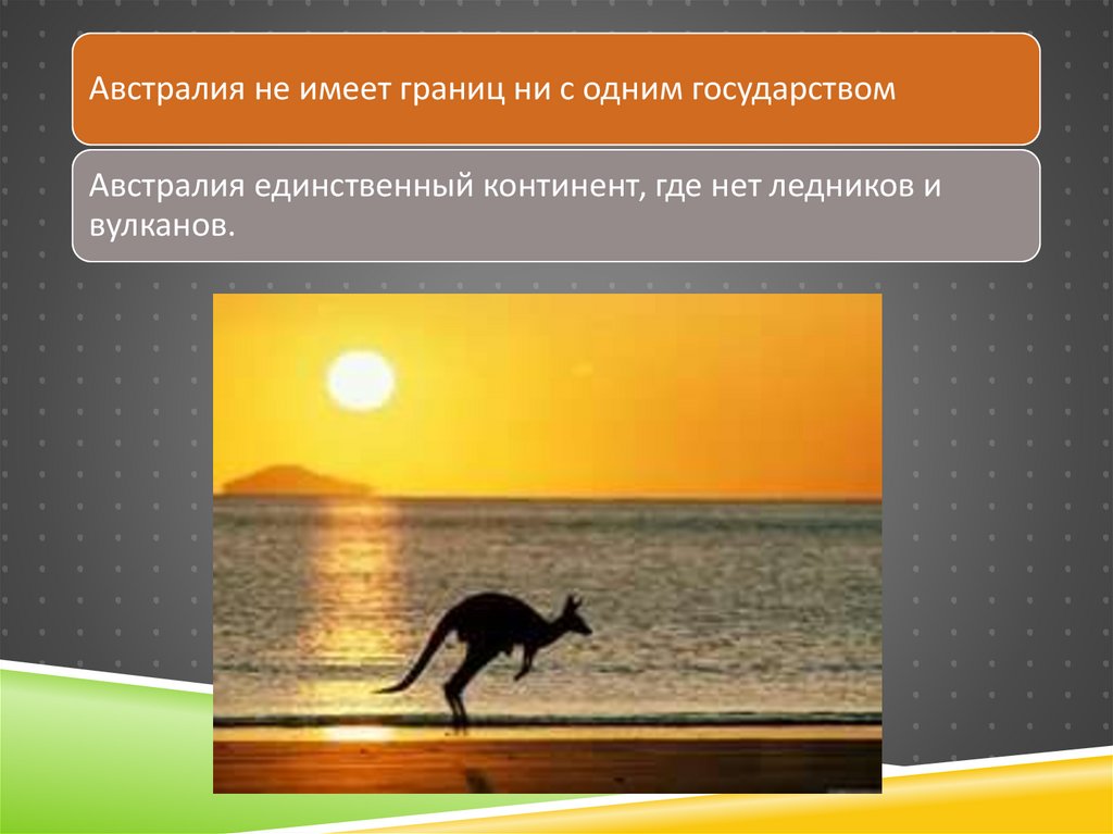 Австралия не имеет границ ни с одним государствомАвстралия единственный континент, где нет ледников и