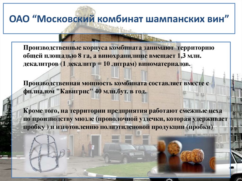 ОАО “Московский комбинат шампанских вин”Производственные корпуса комбината занимают территорию