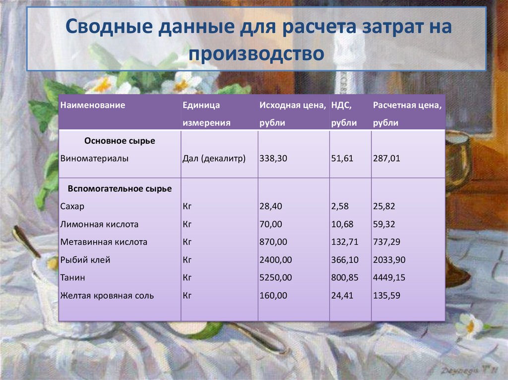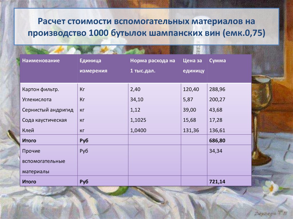 Расчет стоимости вспомогательных материалов напроизводство 1000 бутылок шампанских вин (емк.0,75)