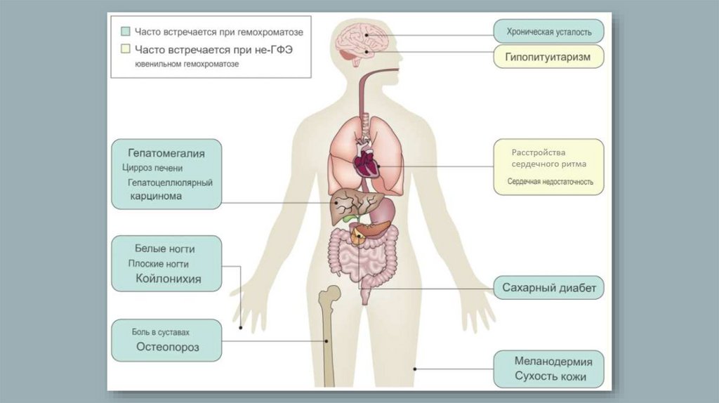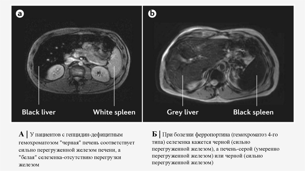 перегруженной железом), а печень-серой (умеренно