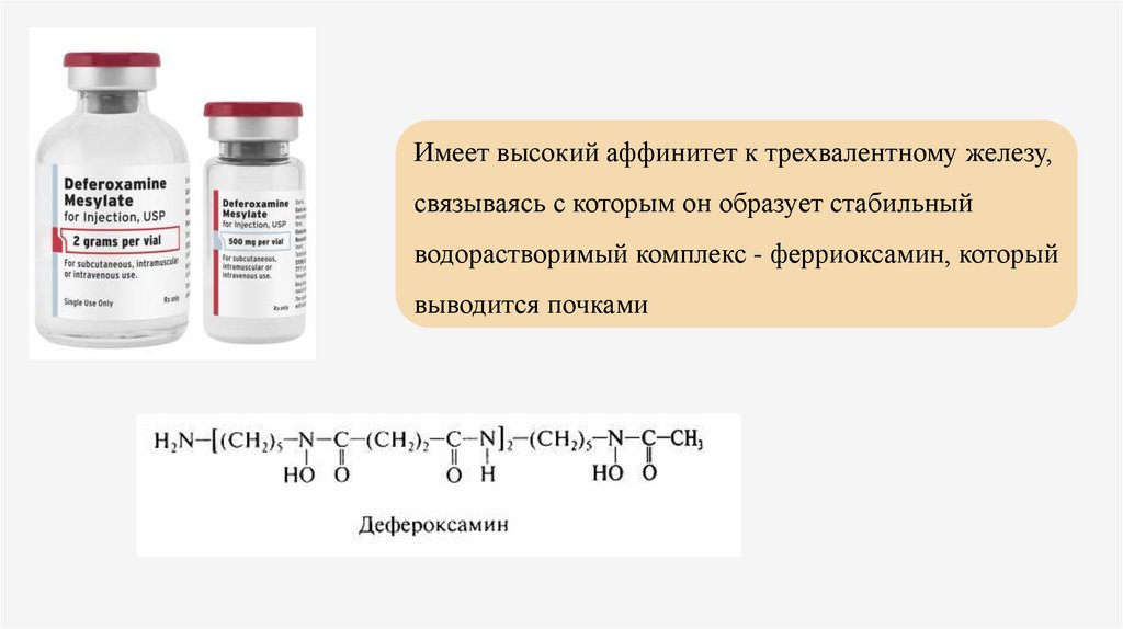 Имеет высокий аффинитет к трехвалентному железу,связываясь с которым он образует стабильный