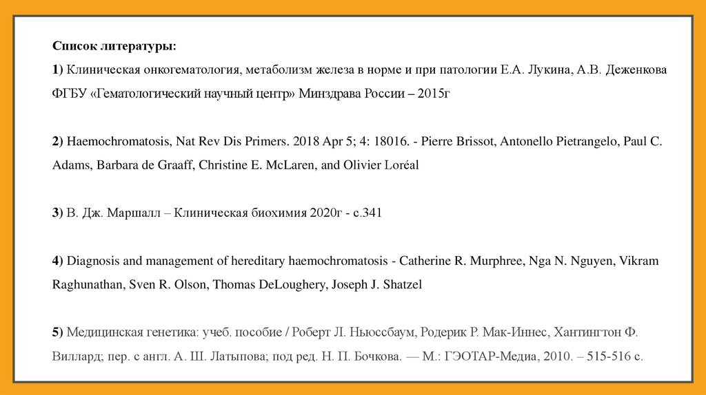 Список литературы:1) Клиническая онкогематология, метаболизм железа в норме и при патологии Е.А. Лукина, А.В. Деженкова