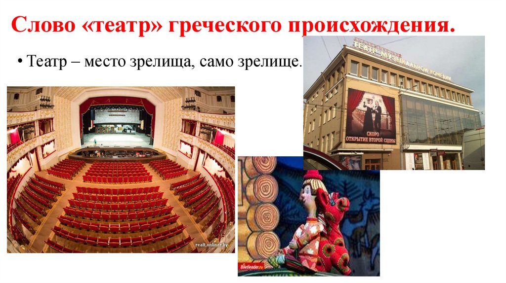 Слово «театр» греческого происхождения.• Театр – место зрелища, само зрелище.
