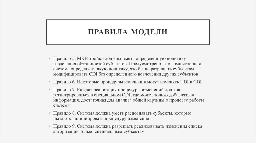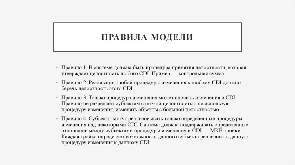 ПРАВИЛА МОДЕЛИ• Правило 1. В системе должна быть процедура принятия целостности, которая