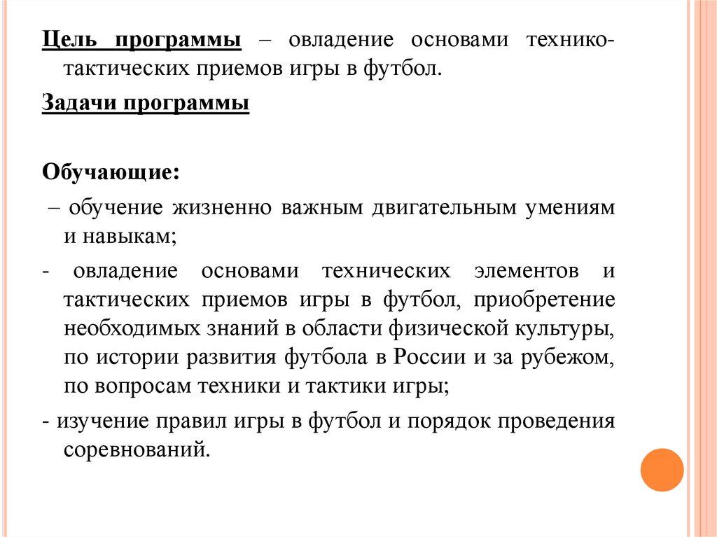 Цель программы – овладение основами техникотактических приемов игры в футбол.Задачи программы