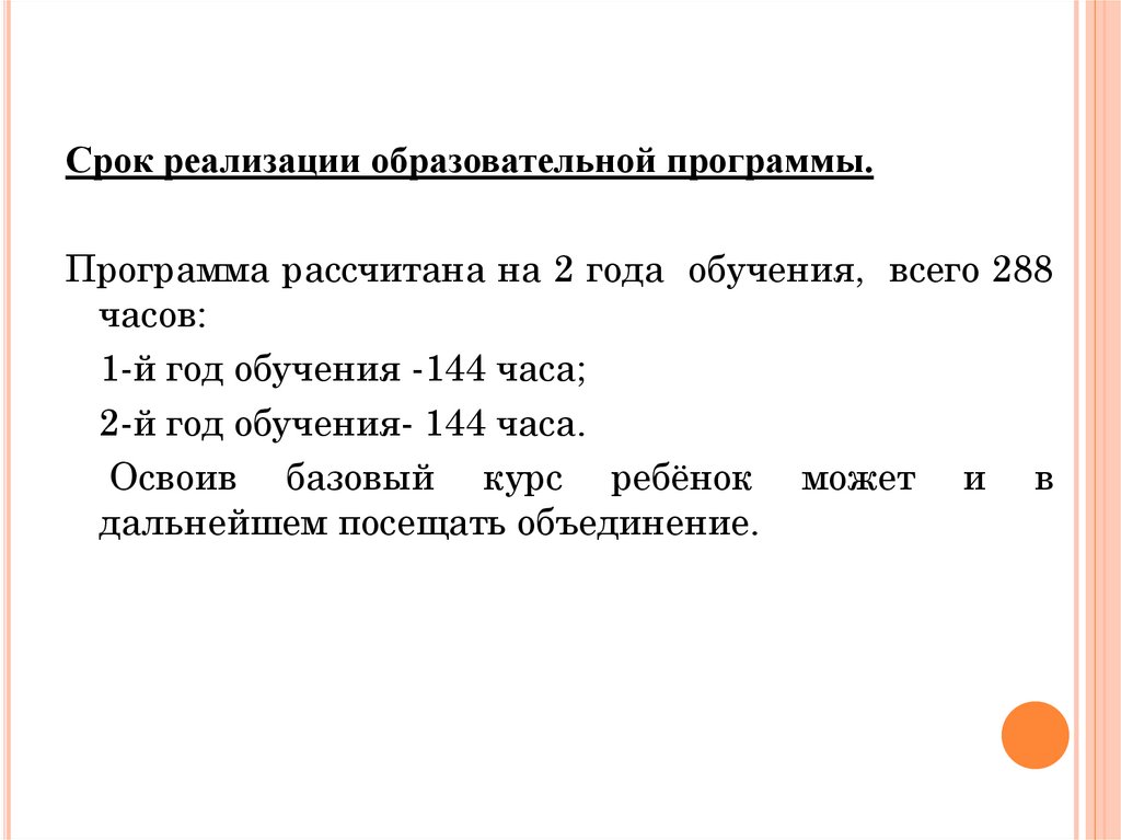Срок реализации образовательной программы.Программа рассчитана на 2 года обучения, всего 288