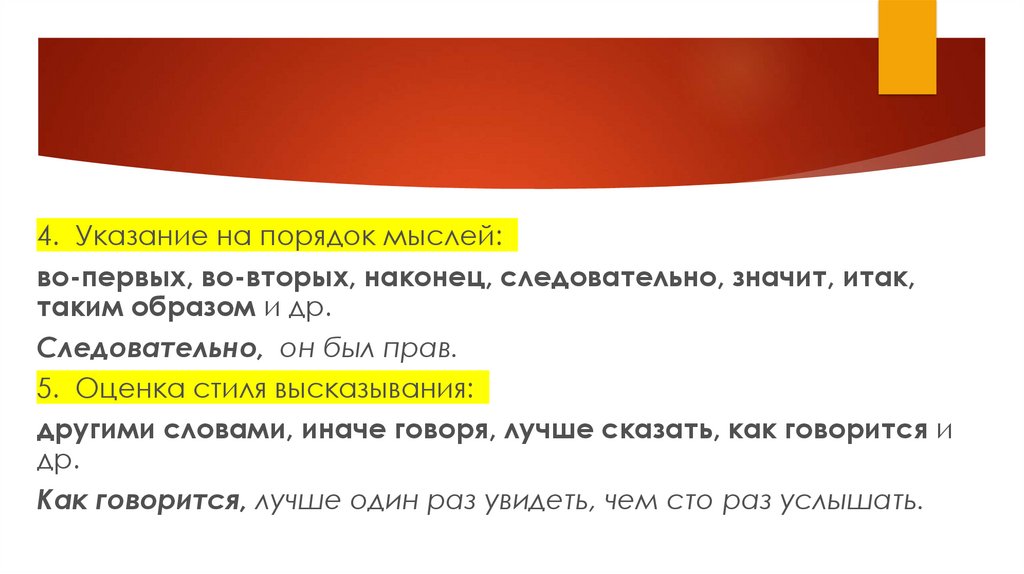 4. Указание на порядок мыслей:во-первых, во-вторых, наконец, следовательно, значит, итак,