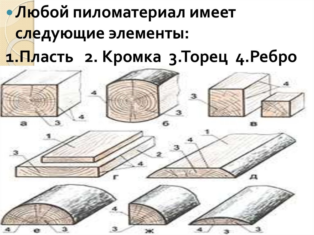 1.Пласть 2. Кромка 3.Торец 4.Ребро