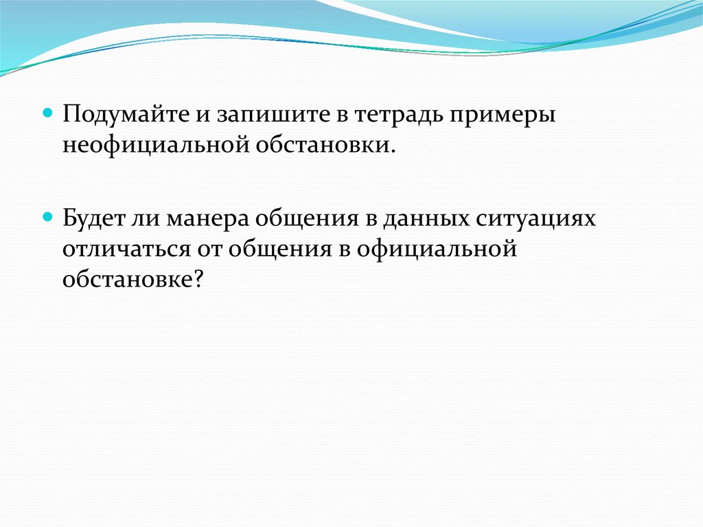 Подумайте и запишите в тетрадь примерынеофициальной обстановки.