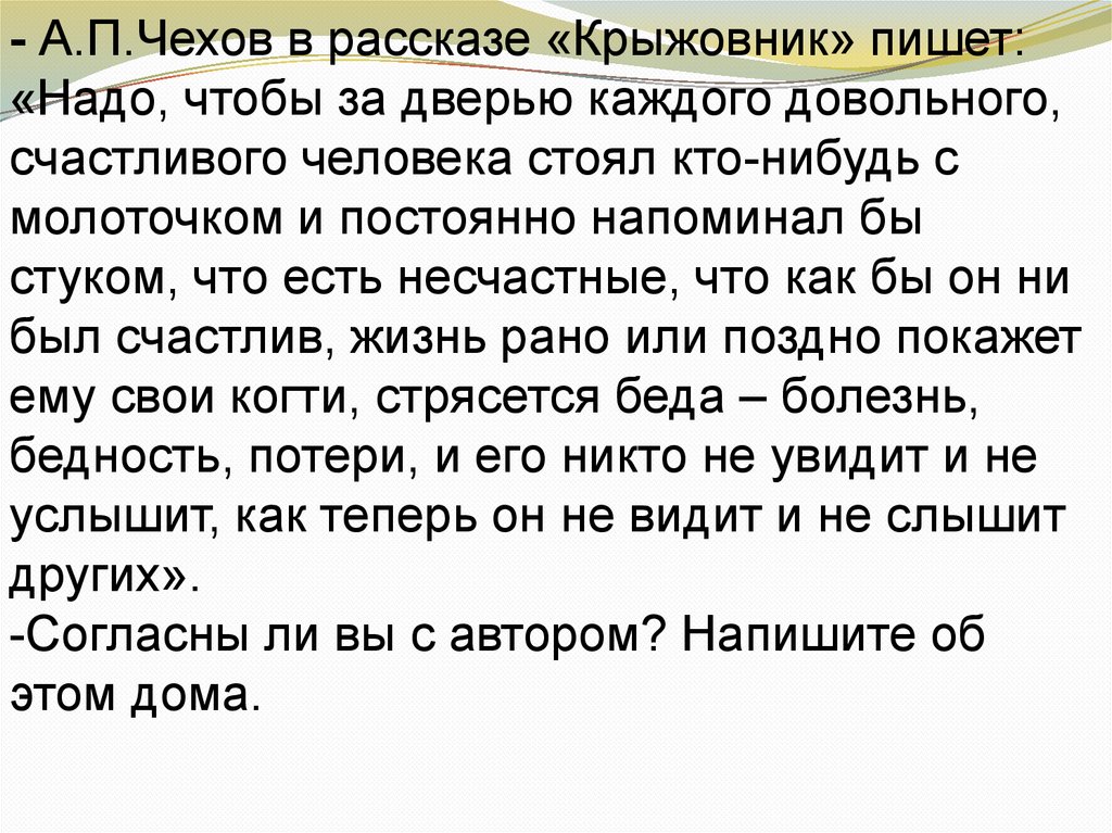 - А.П.Чехов в рассказе «Крыжовник» пишет:«Надо, чтобы за дверью каждого довольного,