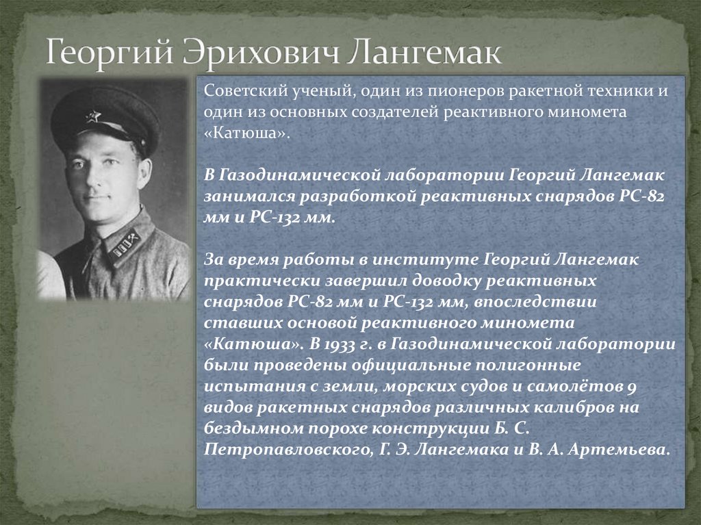 Советский ученый, один из пионеров ракетной техники иодин из основных создателей реактивного миномета