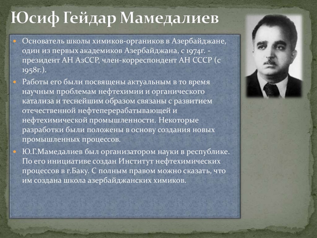 Основатель школы химиков-органиков в Азербайджане,один из первых академиков Азербайджана, с 1974г. президент АН АзССР, член-корреспондент АН СССР (с