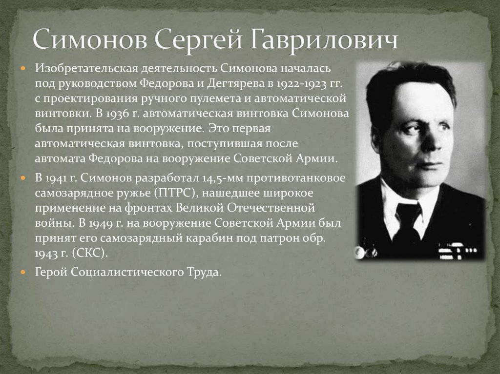 Изобретательская деятельность Симонова началасьпод руководством Федорова и Дегтярева в 1922-1923 гг.