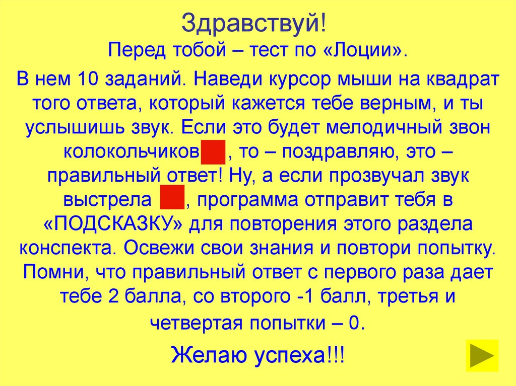 Перед тобой – тест по «Лоции».В нем 10 заданий. Наведи курсор мыши на квадрат
