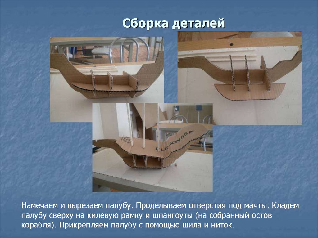 корабля). Прикрепляем палубу с помощью шила и ниток.