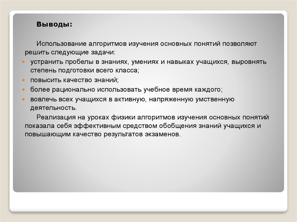 Выводы:Использование алгоритмов изучения основных понятий позволяют