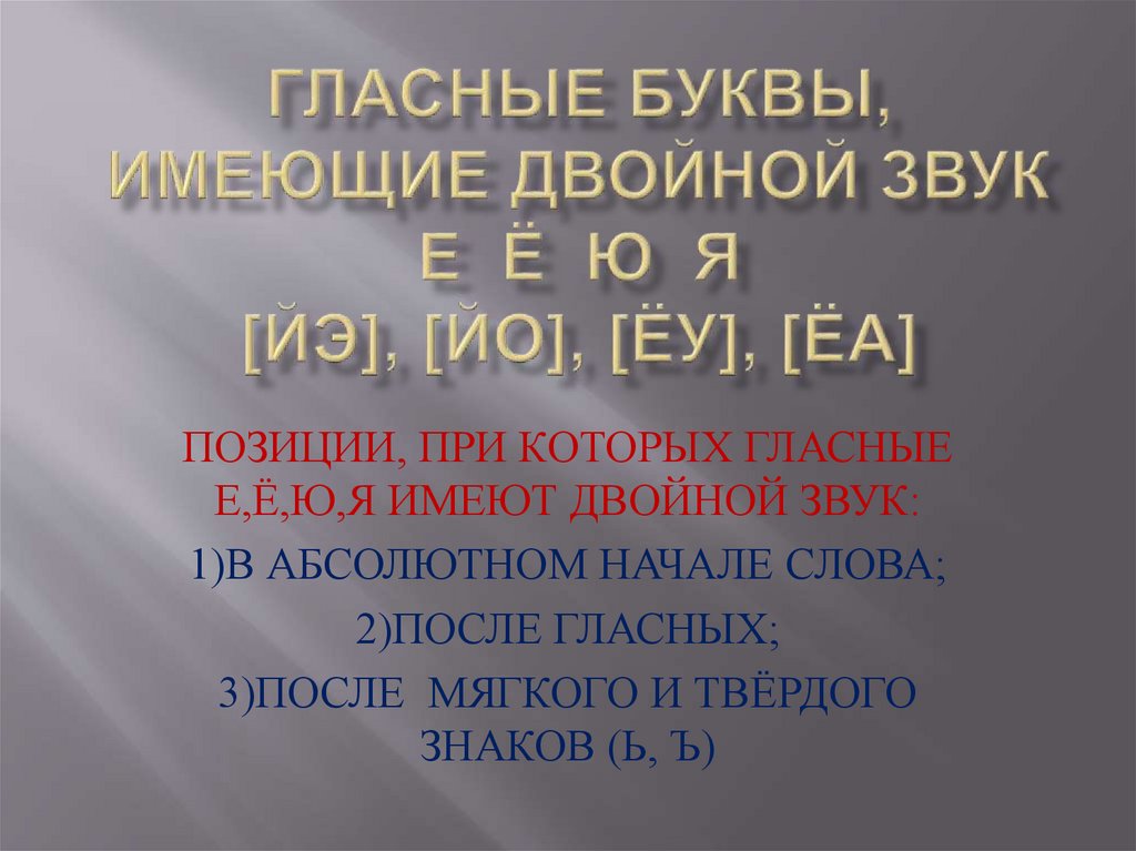 ПОЗИЦИИ, ПРИ КОТОРЫХ ГЛАСНЫЕЕ,Ё,Ю,Я ИМЕЮТ ДВОЙНОЙ ЗВУК: